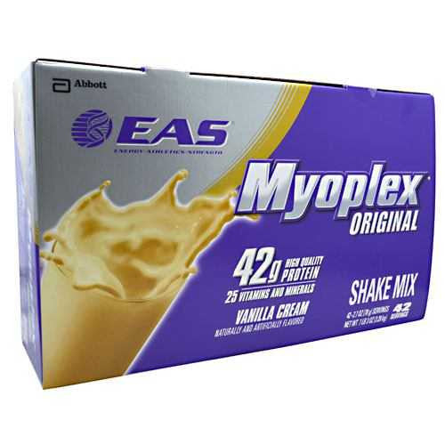42 g Quality protein including whey. 27 Vitamins & minerals. Naturally & artificially flavored. Official product of the Body for Life Program. To maximize your results, use Myoplex as part of your 6-meal a day nutritional program. Consuming three square meals everyday is a nutritional concept of the past. This method of eating often leads to unstable blood sugar levels and prolonged periods of amino acid deficiency. This dietary roller coaster may leave you feeling hungry between meals, and more prone to body fat storage. Plus, without a consistent supply of protein and amino acids, it is nearly impossible to build and maintain the lean muscle youve worked so hard for. To build your best body ever, you have to eat often to regularly fuel your body with high-quality nutrients. At EAS, we recommend feeding your body six times throughout the day for best results. Thats why supplementing up to three meals per day with Myoplex nutrition shakes is a convenient, great tasting way to get the right protein, carbohydrates, vitamins and minerals your body needs to perform at its best. Easting six smaller meals throughout the day ensures that food is absorbed and processed more efficiently, in turn accelerating metabolism, or the rate at which the body burn calories. Eating more frequently also helps to curb appetite, maintain consistent blood sugar levels, as well as increase protein synthesis. This ultimately leads to greater muscle development and body fat loss. Further, eating six nutritious meals a day helps to curb appetite so that you are less susceptible to make poor food choices. EAS recommends supplementing your diet with 2-3 high quality Myoplex nutrition shakes, along with 3-4 whole food meals a day to ensure that any nutritional gaps are filled. Myoplex takes the guesswork out of providing the body with the proper protein, carbohydrates, vitamins and minerals needed to support your active lifestyle. For best results, combine this nutritional guideline with a consistent aerobic and resistance exercise program to achieve your best physique transformation! Three Meals/Day: Three meals per day elicit a roller coaster pattern where nutrient availability and insulin levels rise and fall sharply throughout the day. These peaks and valleys may be a factor in recurrent hunger, decreased energy, and greater accumulation of body fat. Further, eating only three meals a day leads to prolonged periods of amino acid deficiency, which may sacrifice hard-earned muscle. Six Meal/Day: Fueling the body regularly with this plan promotes healthy blood sugar levels allowing for a more consistent insulin level, as well as providing muscles with a steady stream of amino acids for greater protein synthesis. This ensures that nutrients are absorbed and processed more efficiently, elevating the metabolism, sustaining energy, and improving body composition. Myoplex offers a comprehensive convenient and economical tool you can use day in and day out to provide your body with the nutrients you need for your active lifestyle.