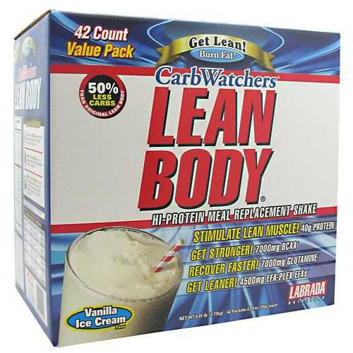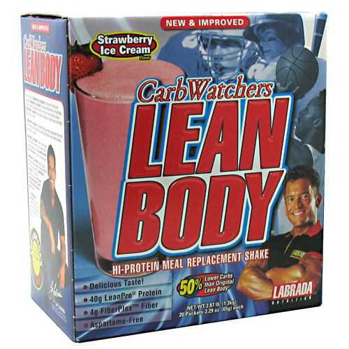 Lean Body Hi-Protein meal replacement shake. Delicious Taste! 40g LeanPro Protein. 5g FiberPlex Fiber. Aspartame-Free. 50% Lower carbs that original lean body. New and improved CarbWatchers Lean Body is the food of champions. I designed CarbWatchers Lean Body to provide athletes with a concentrated source of protein and essential nutrients in an easy-to use, delicious shake. CarbWatchers Lean Body tastes great, will keep you in great shape, and helps you perform at your bes! CarbWatchers Lean Body is the instant, delicious meal replacement drink mix that provides the extra protein and nutrients that athletes need, without extra carbohydrates or calories. CarbWathcers Lean Body makes it easy to stay in great shape, and perform at your peak! Just tear open an easy-to-use packet and stir into 10 oz. of ice-cold water to make a delicious shake. CarbWatchers Lean Body tastes so good that it was awarded an American Tasting institute Gold Medal! Each packet of CarbWatchers Lean Body is a nutritional powerhouse containing 40 grams of high-quality protein, 12 grams of carbs, 4g fiber, and heart-healing soy. Use CarbWatchers Lean Body twice a day in conjunction with your training program and start feeling and seeing the difference. Lee Labradas quality guarantee; "If its on the label, its in the product!" This product is independent bal assayed for purity. Get your CarWatchers Lean Body Today! CarbWatchers Lean Body will help you get leaner and stronger, with 50% lower carbs than Original Lean Body! CarbWatchers Lean Body hi-protein meal replacement shake is the convenient low-carb nutrituin solution for athletes who want to accelerate fat burning while supporting lean muscle tissue. If you have little time to prepare meals, CarbWatchers Lean Body is for you. You get it all in Lean Body concentrated muscle-building, fat burning nutrition in one delicious, easy-to-make shake. Just stir a packet of CarbWatchers Lean Body into 10oz. of cold water or skim milk and enjoy! Check out the low carb, muscle building nutrition you get in CarbWatchers Lean Body is the best tasting reduced=carbohydrate meal replacement powder (MRP) ever made. Thats shy the American Culinary Institute awarded Lean Body its Gold Medal Taste Award for five years in a row. 65/20/15 (protein/carbohydrate/fat) ratio of macronutrients consisting of highly bio-available, time-release proteins plus a controlled amount of high-fiber complex carbohydrates and exxential fatty acids, to support lean muscle growth, strength, and higher energy all day long! 40g of LeanPro proprietary blend of fast-release and slow-release proteins, to give you a sustained flow of vital amino acids (See Amino acids support intracellular nitrogen retention levels for faster muscle growth and strength increases. Over 7,000mg of BCAAs (Branched Chain Amino Acids)-per serving. BCAAs have an anti-catabolic effect (prevents muscle tissue breakdown). Over 8,000mg of Glutamine and Glutamic Acid. Studies show that supplemental glutamine can also prevent muscle breakdown. 12 grams of an advanced blend of low-glycemic, high fiber carbohydrates to help stabilize your blood sugar and insulin levels, and promote greater energy and fat burning. 4 grams of FiberPlex dietary fiber per serving, providing over 30% of the RDA for fiber to support superior intestinal health and cardiovascular health. 4.5 grams EFA-Plex containing natural -source omega-3 and -6 fatty acids, medium-chain triglycerides, Flaxseed Oil and Borage Oil. Aspartame-Free. Contains no Trans Fat. Contains 24VBitamins and Minerals. No Artificial Colors or Preservatives. No Maltodextrin. Instantized; just tear open a convenient packet, stir into 10oz. cold water or skim milk, and enjoy a delicious shake! Typical Amino Acid Profile/BCAAs (per serving) Alanine 1780 mg; Arginine 1370 mg; Aspartate 4760 mg; Cystine 920 mg; Glutamate 6790 mg; Glycine 900; Histidine 720 mg; Isoleucine 2130 mg; Leucine 3570 mg; Lysine 2910 mg; Methionine 820 mg; Phenylalanine 1410 mg; Proline 2100 mg; Serine 1870 mg; Thereonine 2250 mg; Tryptophan 750 mg; Tyrosine 1180 mg; Valine 2050 mg: