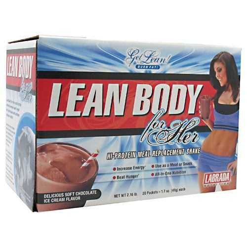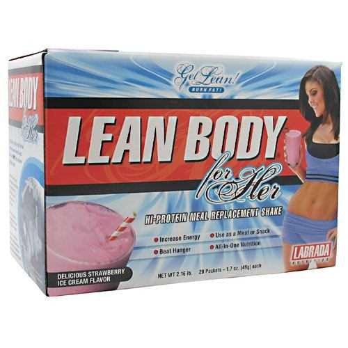 Meal Replacement Shake. Makes a Delicious, Creamy Shake. Easy-to Use Packets! Delicious Taste! 30 g Protein per serving! Use as a Meal or Snack. Aspartame-Free. High Calcium/Low Fat. Lean Body for Her is rich in the nutrients women need to get into great shape and achieve optimum health! Lean Body for Her is high in protein, ideal for low carb diets and is fortified with soy protein, folic acid, and essential vitamins and minerals. Use it twice daily as a meal replacement, or as a treat between meals. Lean Body for Her is a delicious, nutritious shake that can help you achieve your self improvement goals! Get In Shape! Who should use Lean Body for Her? Women of all ages who desire to tone lean muscle, burn unwanted fat and reduce inches from their hips, thighs, and buttocks. Lean Body for Her works best when used in conjunction with a low calorie diet and exercise. What can Lean Body for Her do for me? Lean Body for Her is a unique meal replacement powder formulated specifically for womens nutritional needs. It is high in the nutrients that an active woman needs to get into great shape and achieve optimum health. It contains the "nutritional insurance" you need when you are dieting and losing fat. Is Lean Body for Her easy to use? Yes! Lean Body for Her comes in convenient, serving size packets that fit easily into your purse, briefcase, or gym bag. Whenever you want a fast, delicious and nutritious meal or snack, just tear open the packet and mix with cold water, skim milk, or juice. How should I use Lean Body for Her? Lean Body for Her should be used twice per day as a meal replacement or as a treat in between meals. How does Lean Body for Her Work? Lean Body for Her contains a combination of healthy ingredients that work together synergistically to provide nutritional support of lean muscle tissue, fat loss, and increasing energy. Heres what you get in every packet of Lean Body for Her: 30 grams of high-quality protein. Protein is necessary for the maintenance and repair of lean muscle tissue, the very tissue responsible for helping you look fit, trim, and shapely. Contains a precise blend of heart-healthy soy protein and highly bio-available when protein isolate--to help feed lean muscle tissue with the nutrients necessary to maintain a fast, fat-burning metabolism. If you are weight-training and doing cardio several times a week to get leaner, you will need to consume adequate amounts of protein to achieve your goals. Only 9 grams of carbs. Controlling carbohydrate consumption can help you burn stubborn body fat by helping you keep insulin (a powerful fat storage hormone) levels low. Bone Supporting Nutrients. Bone health is especially important for women, as osteoporosis is five times more common in women than men. Contains soy isoflavones, which are plant compounds with chemical structures similar to estrogen. These isoflavones have a positive effect on bone health and bone loss. Contains 40% of the Daily Value or 400 mg. of calcium. The National Institutes of Health recommends women consume 1,000 mg. of calcium each day to help prevent osteoporosis. Folic Acid is a B vitamin that helps the body make healthy new cells. Folic acid has benefits for women of all ages. Studies show that folic acid may help in the prevention of heart disease, stroke, some cancers, and Alzheimers disease. One serving of Lean Body for Her contains a third of the government recommended dose of folic acid. Iron is essential to making healthy red blood cells and carrying oxygen to the bodys tissues. Iron deficiency anemia is common in women. According to the Mayo Clinic, one in five women and half of all pregnant women are iron deficient. Lean Body for Her contains 25% of the RDA for iron. Glutamine is an amino acid with a super-unique role: It can be utilized by the body as a fuel, used for a new body protein, and to make other important compounds and amino acids. The good news is that recent studies show that supplemental glutamine helps prevent muscle breakdown. Lean Body for Her contains over 7,500 mg. of Glutamine & Glutamic Acid. Antioxidants including Vitamins C and E to help protect your body against free radicals and B Vitamins for proper metabolism of protein and fat, and to help support nerve and brain function. The statements on this box have not been evaluated by the Food and Drug Administration. This product is not intended to diagnose, treat, cure, or prevent disease.
