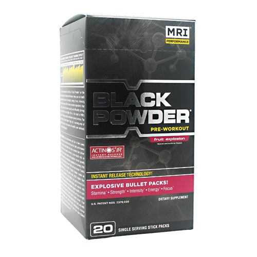 Instant release technology! Explosive Bullet Packs- stamina, strength, intensity, energy, focus. Now, you can reach unprecedented levels of strength, energy, focus, intensity, stamina, and power. Black Powder provides ingredients that impact your ability to recover quickly and efficiently; driving muscle growth to new heights. This is the result of MRIs quest to develop a precision-calibrated training formula. The technologies in Black Powder "light up" a stunning array of metabolic targets to power and amplify your workouts for optimal performance. THE SCIENCE: Driving performance and size to new levels. Scientifically, nitric oxide forms the basis for both performance and size. Nitric oxide dilates the blood channels tht deliver vital training and recovery nutrients to your muscle cells. In addition, nitric oxide signals and regulates muscle growth, muscle contraction, and metabolic adaptation to training. Until now, nitric oxide had a "pre-set" limit. Not any longer. Thanks to MRIs innovative ACTINOS2 IR, Black Powder creates an immediate surge in nitric oxide levels, 950% higher than previously attainable. In an instant, the performance/size nutrient complex in Black Powder floods your muscle cells. Your bodys performance and growth signals amplify in both frequency and duration, starting at your first set! Your strength, intensity, and focus hit levels theyve never known. Your recovery starts before you even leave the gym. Thats why with Black Powder, youll get the most outrageously intense workout of your life, and youll have the super-dilated skin-ripping pumps to prove it!