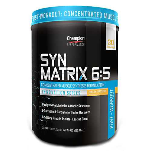 Concentrated Muscle Synthesis Formulation. Designed To Maximize Anabolic Response. L-Carnitine L-Tartrate For Fast Recovery. 6:5 Whey Protein Isolate – Leucine Blend. SYN Matrix 6:5 is built on cutting-edge research showing superior muscle synthesis when consuming Protein and Leucine in a concentrated post-workout product. The Champion Performance scientists included a proprietary recovery matrix into the formulation to create a truly unique product with a one-two punch of muscle building and workout recovery nutrients. SYN Matrix 6:5 formula is designed to utilize the unique properties of Leucine as the key BCAA for building lean muscle mass while also increasing the rate your body burns fat. Clinical scientific research has shown that a concentrated dosage of the specific ratio of 6 grams of Whey Protein Isolate and 5 grams of Leucine in a specialized blend has superior muscle building properties when compared to traditional protein supplementation. Simply put, SYN Matrix 6:5 means huge muscle building potential in a small package. The recovery matrix of SYN Matrix 6:5 contains HICA, a metabolic of leucine, which is proven to support lean muscle mass growth and reduce training related to soreness.