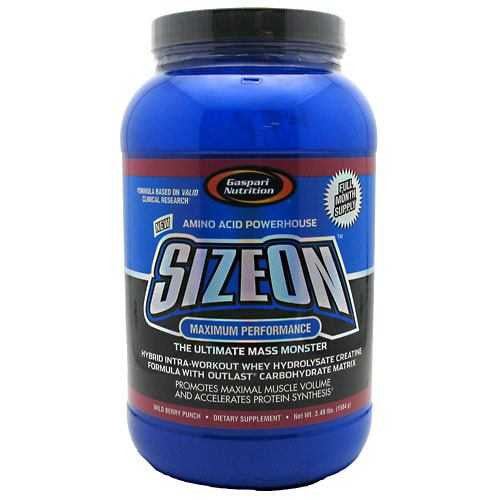 New, Amino Acid Powerhouse. SizeOn Maximum Performance. The Ultimate Mass Monster. Hybrid Intra-Workout Whey Hydrolysate Creatine Formula with Outlast Carbohydrate Matrix. Promotes Maximal Muscle Volume and Accelerates Protein Synthesis. Dietary Supplement. Formula Based on Valid Clinical Research. Dramatic Results. Full Month Supply. There is Zero Doubt Size On Will: Accelerate Protein Synthesis & Muscle Force Recovery; Increase Muscle Volume, Muscle Fiber Size, Cell Volume & Plasma Amino Acid Levels; Amplify S6K1 and 4E-BP1 Signaling and Hypertrophic mTOR Pathway Conductio; Initiate & Sustain Myogenensis and Muscle Recovery While You Are Still Training; Deliver Vital Nutrients, Essential Minerals, and Growth Cofactors To Skeletal Muscle Tissue; Harness the Insulintrophic and Anabolic Power of Pterostilbene. Gaspari Nutrition took Sports Nutrition to the highest level with the original SizeOn, the original intra-workout creatine drink. There wasnt any doubt it represented a serious innovative leap forward in the creatine category. The original SizeOn formula clearly demonstrated its effectiveness in a clinical setting and quickly became known as the King of Creatines. As clinical research advances, so does Gaspari Nutrition which is why SizeOn has now evolved into the Ultimate Hybrid Intra-Workout Whey Hydrolysate Creatine Formula. Once again Gaspari Nutrition raises the bar even higher in the sports nutrition Industry. Your body requires that proteins from whole food, whey isolate, casein, etc., be broken down in a process called hydrolyzation. This is an integral process which allows di and tripeptides to be absorbed and utilized for numerous processes including muscle building and repair. The problem is that while your muscles are starving for these nutrients (i.e. during exercise) your body must digest them into smaller peptides. Research has shown that these are absorbed even faster than free form amino acids. For this reason Gaspari Nutrition uses a high quality whey hydrolysate that contains over 50% di and tripeptides as well as a large array of anabolic promoting ingredients such as a high dose of L-Leucine (5 grams) to allow for unparalleled increases in athletic performance, skeletal muscle recovery, explosiveness and most notably, immediate increases in muscle size While You Are Still Training. Furthermore Gaspari Nutrition researchers have harnessed the power of pterostilbene which is our patent pending and brand new insulinogenic secretegogue picked specifically to work in concert with our famed and patent pending Outlast carbohydrate blend. Outlast is a patent pending blend of three complex sugar molecules that lasts up to 5X longer than plain maltodextrin. This powerful combination initiates and sustains muscle volumization and anabolism to levels never seen before in a sports nutrition product. Pterostilbene, is milligram per milligram, by far the most powerful insulinotropic compound ever utilized in a dietary supplement. To top it off, we also included Lola, our cutting-edge, ammonia scavenging amino acid salt of L-Ornithine and L-Aspartate to help battle fatigue. The bottom line is that Gaspari Nutrition has once again outdone itself and yet again redefined the very category if created. Every single ingredient in SizeOn was selected specifically and solely for the scientific evidence to support efficacy and safety. You can be assured this product is formulated based on Valid scientific research and not overhyped nonsense which doesnt deliver the results you demand and pay for. Train Harder, Faster & Longer with SizeOn! (These statements have not been evaluated by the Food and Drug Administration. This product is not intended to diagnose, treat, cure or prevent any disease). SizeOn Proprietary Blend 62.2g: Outlast Insutropin Matrix: Palatinose (Isomaltulose), D-Glucose, Trehalose, Pterostilbene. Protein Synthesis Acceleration Matrix: Whey Protein Hydrolysate, L-Leucine (5g), L-Isoleucine, L-Valine, L-Ornithine-L-Aspartate. PhosphoDrive Endurance Complex: Creapure (Creatine Monohydrate), Creatine MagnaPower (Magnesium Creatine Chelate), Disodium Creatine Phosphate. OsmoDrive Advanced Hydration Complex: L-Taurine, Sodium Glycerophosphate, Calcium Glycerophosphate, Potassium Glycerophosphate, Sustamine (L-Alanyl-L-Glutamine), Magnesium Glycyl Glutamine.