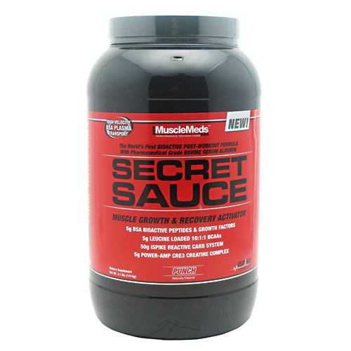 The Worlds first Bioactive Post-workout formula with Pharmaceutical grade Bovine Serum Albumin. Muscle Growth & Recovery Activator. 5g BSA Bioactive peptides & growth factors, 5g Leucine loaded 10:1:1 BCAAS, 50g iSpike reactive carb system, 5g Power-AMP Cre3 creatine complex. SECRET SAUCE is the worlds first BIOACTIVE POST-WORKOUT FORMULA enhanced with pharmaceutical quality BSA (Bovine Serum Albumin) for potent anabolic action and fast recovery. BSA is a scientifically documented bioactive protein derived from bovine blood plasma. Research shows that BSA can rapidly speed up the revitalization of muscle tissue, thus helping to build bigger and stronger muscles. While BSA is the central core to SECRET SAUCEs anabolic action, this unique and advanced post-workout formula contains many other powerful clinically researched ingredients. During the development process of SECRET SAUCE, the scientists at MuscleMeds endeavored to formulate a product that not only stimulates protein synthesis, but also modulates the anabolic effects of insulin and replenishes muscle glycogen and ATP, which are critical for optimal post-workout supplementation. SECRET SAUCE doubles down with both naturally occurring leucine in BSA and an additional 5 gram leucine-loaded dose of BCAAs in an anabolic 10:1:1 ratio to trigger increased protein synthesis. To ensure peak ATP replenishment, SECRET SAUCE utilizes MuscleMeds Power-AMP Cre3™ Creatine Complex consisting of creatine monohydrate, Creatine Magnapower® and creatine gluconate. Post-workout creatine uptake and ATP replenishment is enhanced by BSAs plasma transport gradient, leading to increased cell volumizing, muscle size and recovery. The next important step to complete post-workout supplementation is to optimize the anabolic activity of insulin and replenish glycogen. SECRET SAUCE has taken insulin spiking and glycogen replenishment to a new level with the inclusion of the insulinotropic amino acids glycine and phenylalanine, in combination with MuscleMeds proprietary iSPIKE Insulin-Release-Amplifying Reactive Carbohydrate System. These insulinotropic aminos work in tandem with the iSPIKE reactive carbohydrates and BSA plasma transport to activate a highly anabolic insulin surge and super fast muscle glycogen and ATP saturation. This dynamic trio also enhances the uptake of other key nutrients, peptides and growth factors in BSA to trigger the post-workout growth and repair of muscle tissue.