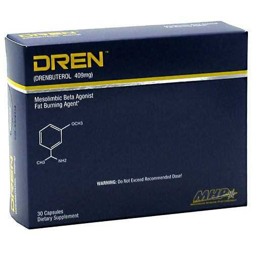 Dietary supplement. (Drenbuterol 409mg) Mesolimbic beta agonist fat burning agent. Maximum human performance. Dren (Drenbuterol) belongs to a powerful new class of compounds called mesolimbic beta agonists, which have extremely powerful fat burning and euphoric activities. Drenbuterol is a patent pending compound scientifically formulated to stimulate both metabolic and mesolimbic pathways for extreme thermogenic fat burning and neurotropic feel good sensory. Each Dren capsule provides the maximum 409mg dose of Drenbuterol and should only be administered once daily and not be used with other stimulants. When taken as directed, Dren will help stimulate the thermogenic fat burning process, increase energy levels, suppress appetite and illicit a state of heightened mental euphoria. These statements have not been evaluated by the Food and Drug Administration. This product is not intended to diagnose, treat, cure or prevent any disease.---Mesolimbic Beta Agonist Complex: Caffeine, L-5 Hydroxytryptophan, Beta Methoxyphenylethylamine and Yohimbine HCl).